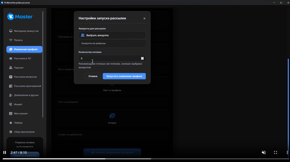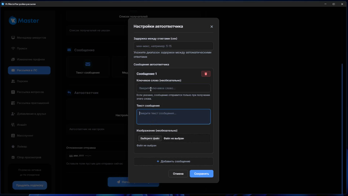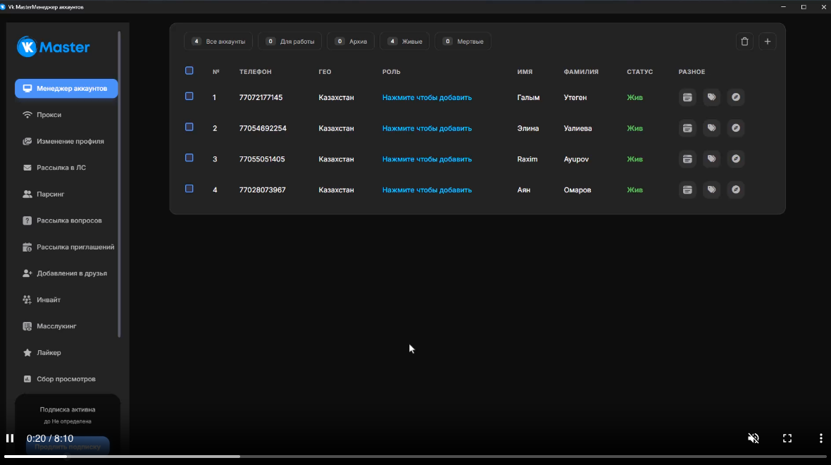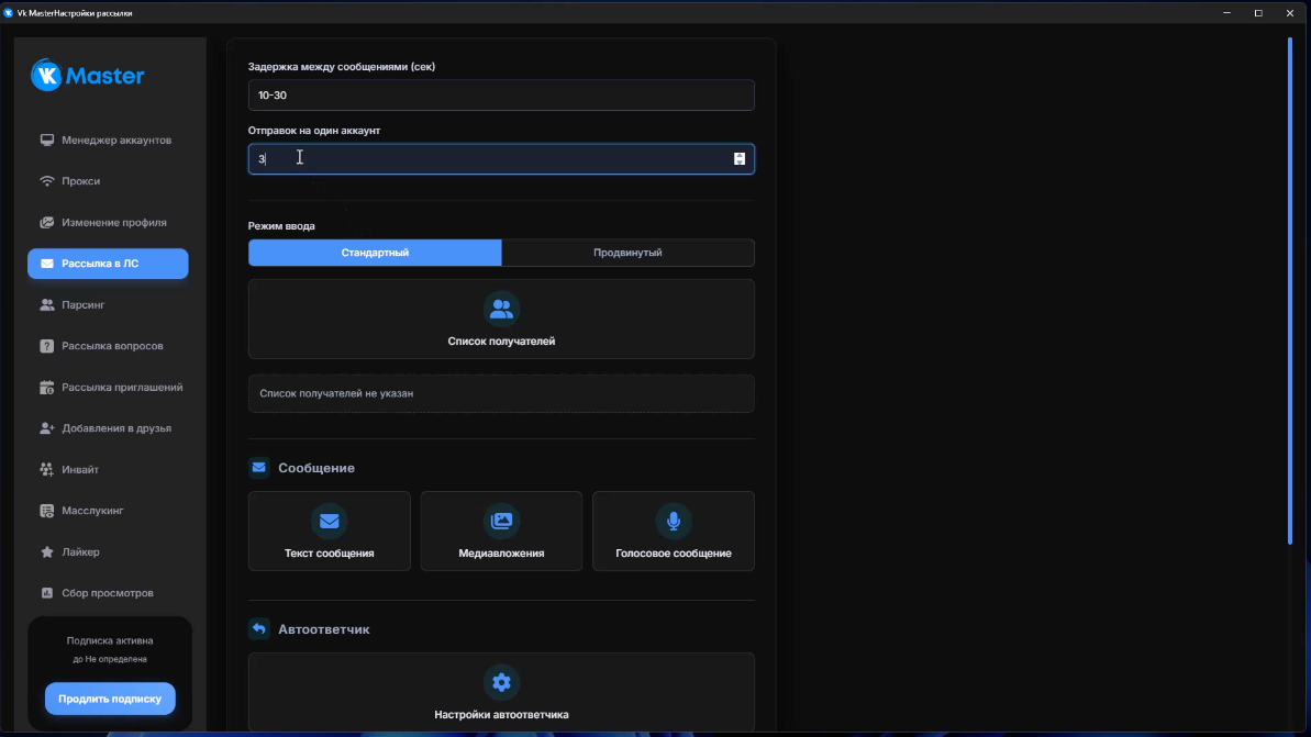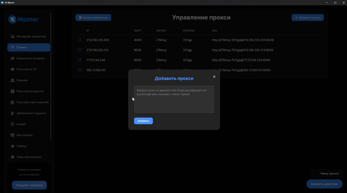 VK Master поддерживает использование прокси-серверов, что позволяет безопасно работать с большим количеством аккаунтов, снижая риск их блокировки.