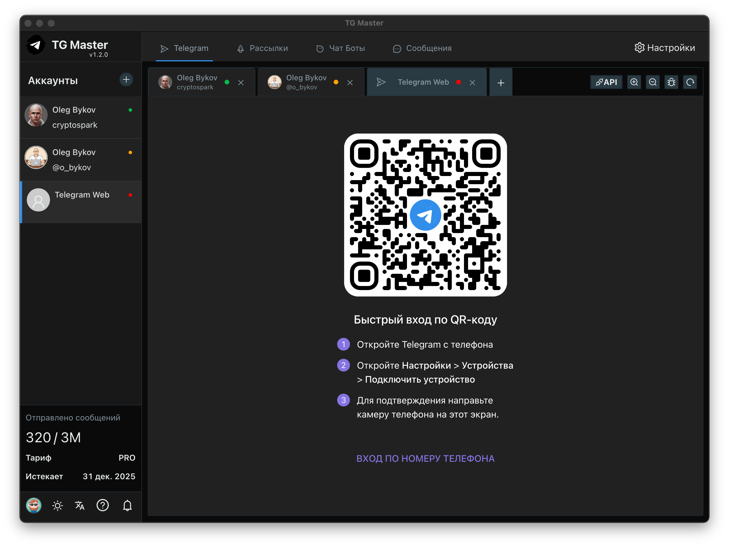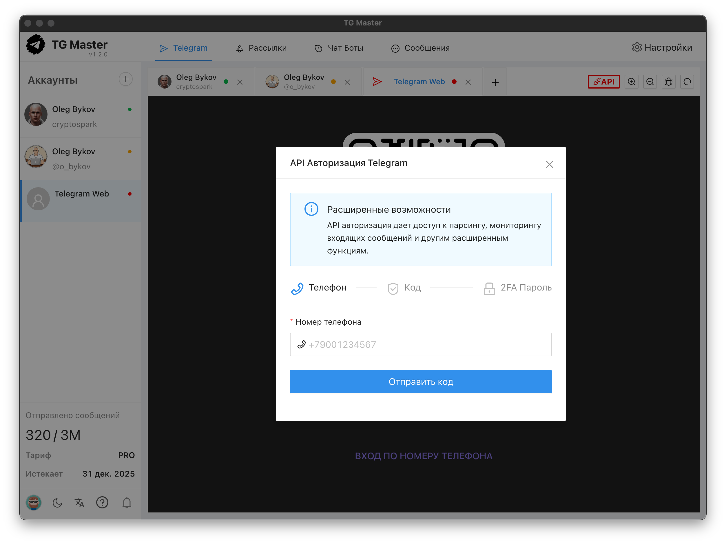 Работа с API и WEB: Программа комбинирует методы работы через Telegram API и Web-версию, что повышает стабильность и расширяет возможности автоматизации.