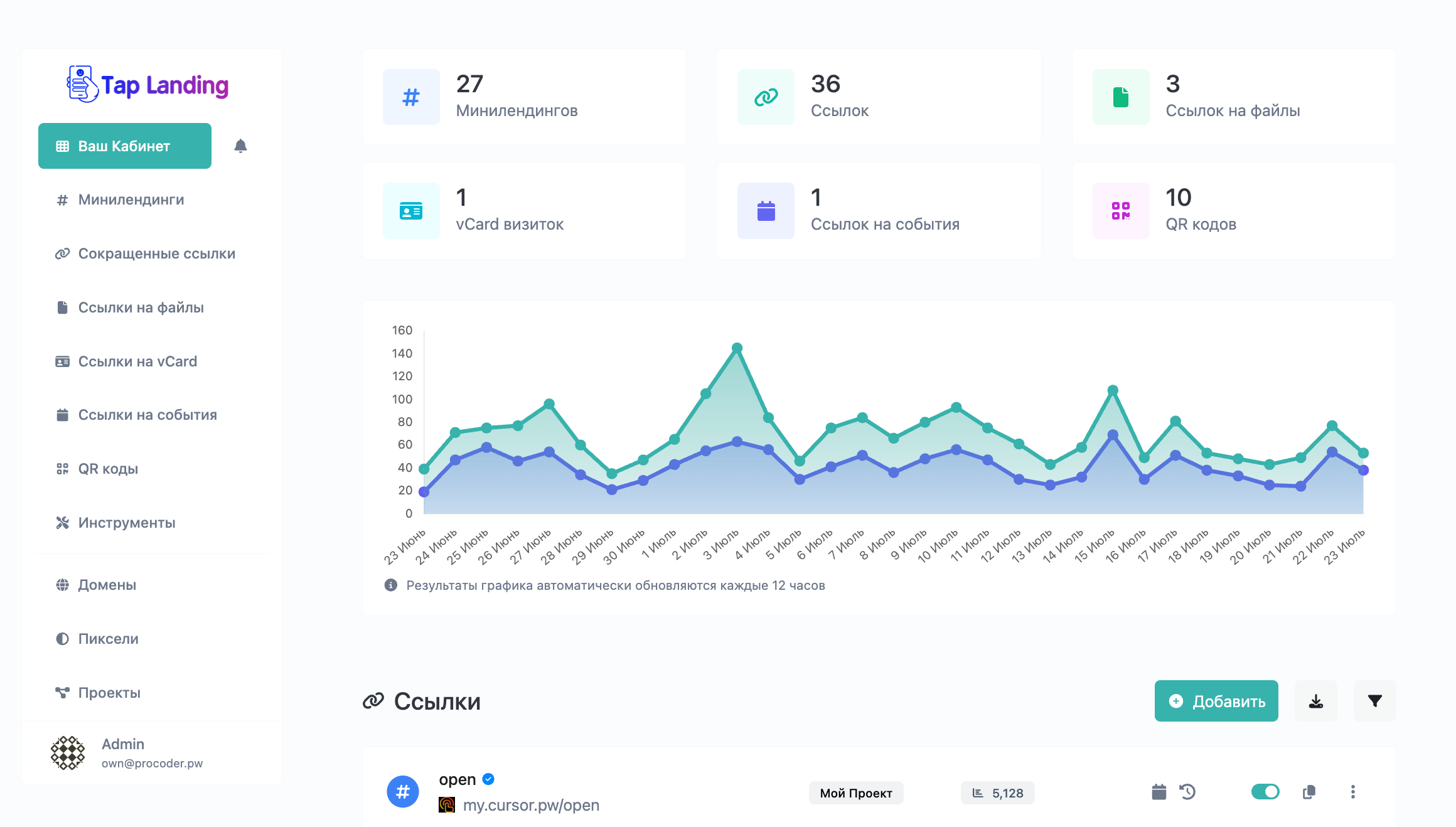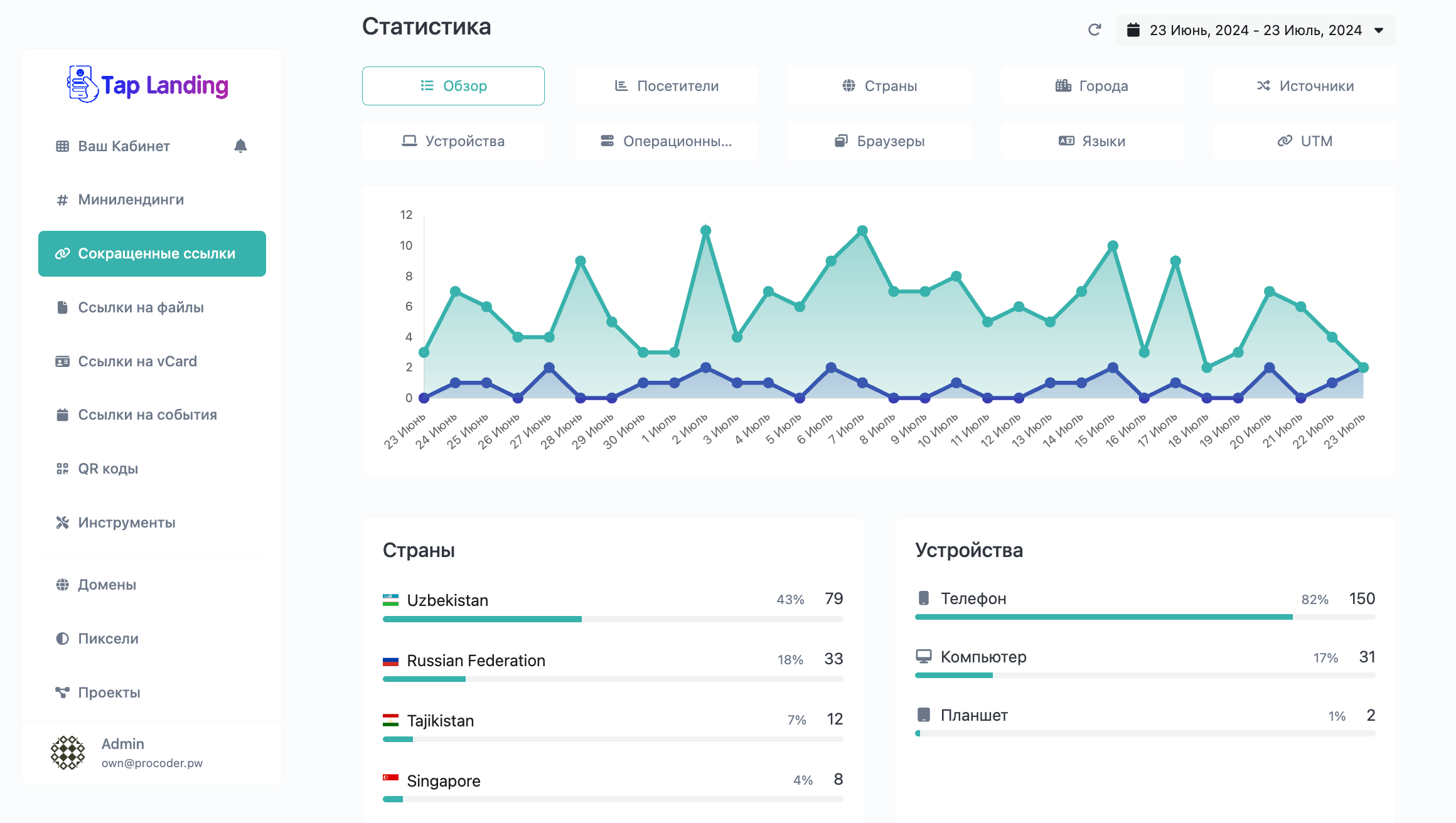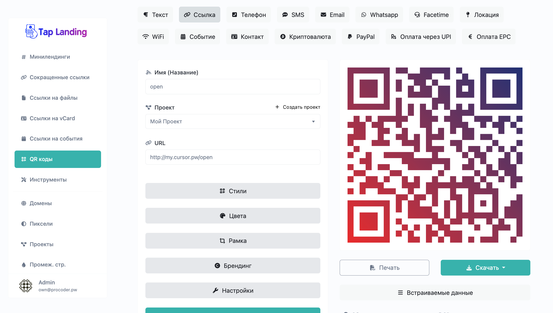 Сервис предлагает удобный конструктор для настройки дизайна лендингов с возможностью добавления собственного домена и SEO-настроек. Пользователи могут создавать и настраивать QR-коды, отслеживать подробную статистику посетителей и использовать разнообразные веб-инструменты.