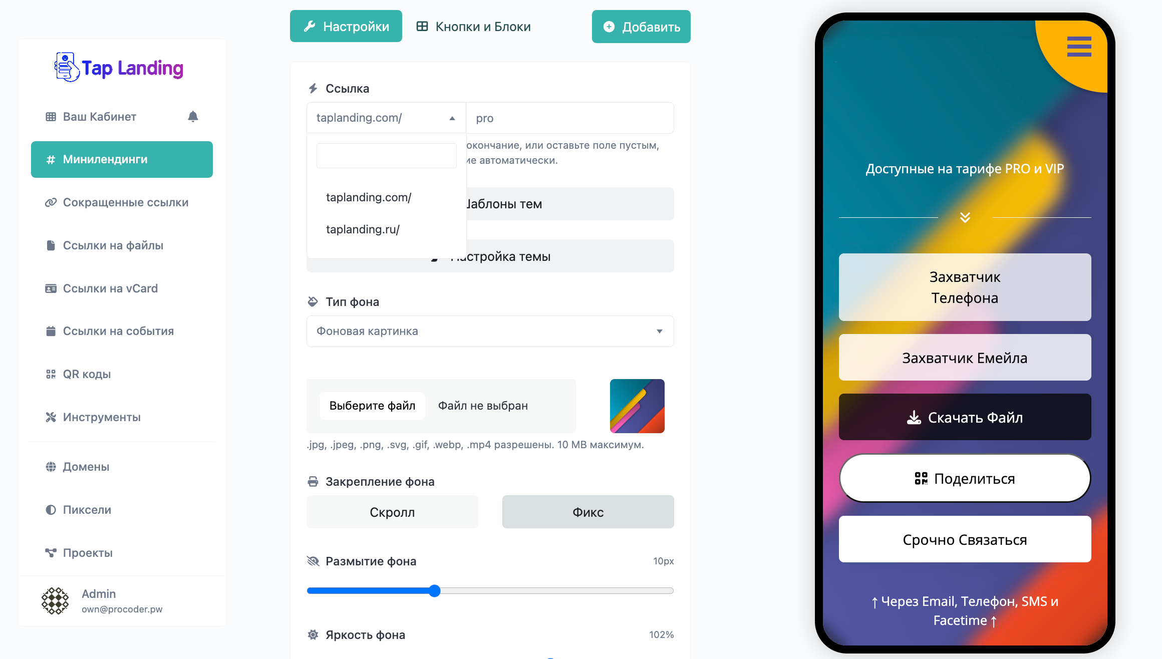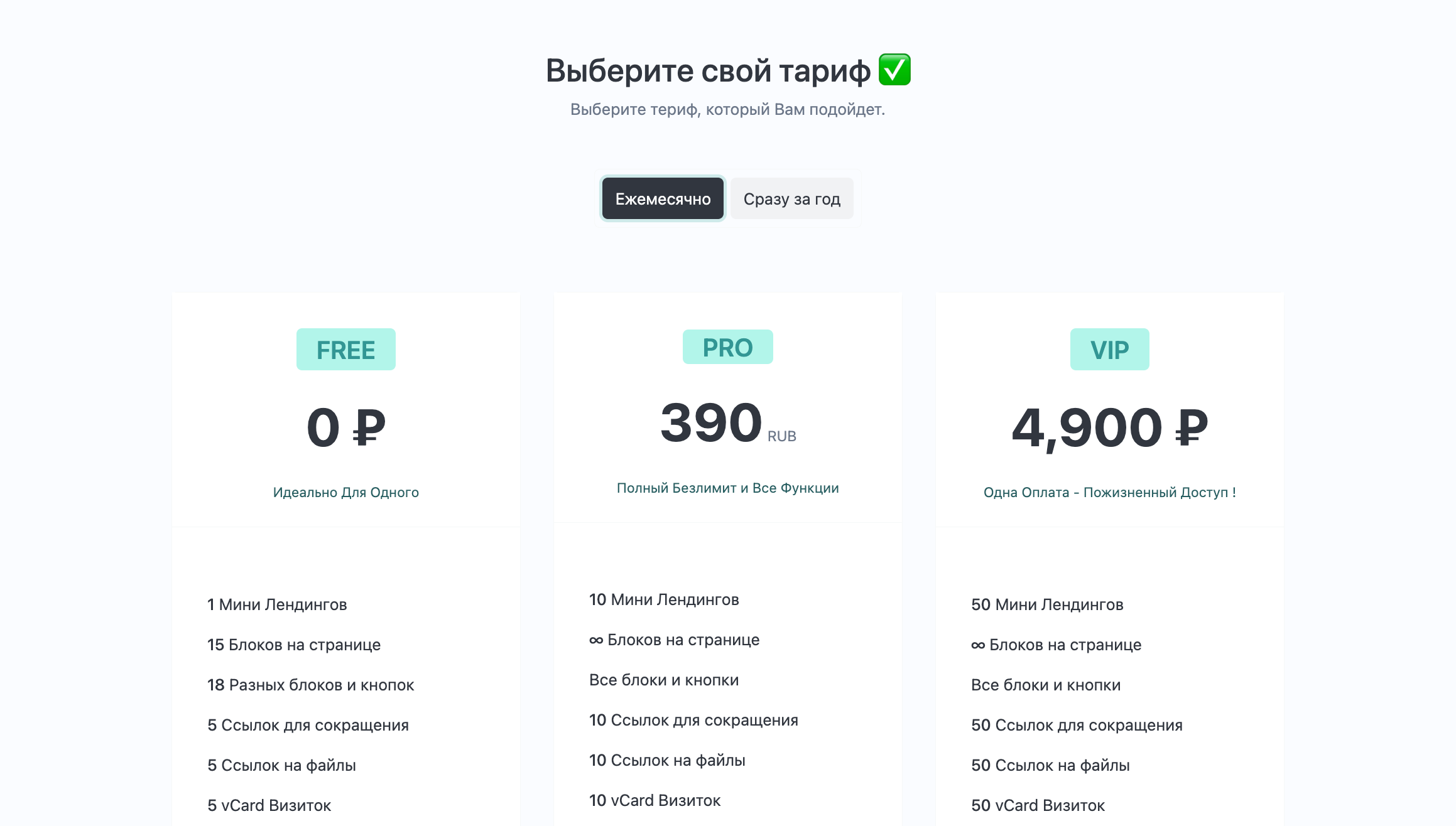 TapLanding также позволяет группировать ссылки и лендинги по проектам и подключать пиксели для аналитики. Сервис предлагает несколько тарифных планов: бесплатный с ограниченными функциями, платный с расширенными возможностями и VIP-план с пожизненным доступом и максимальными функциями.