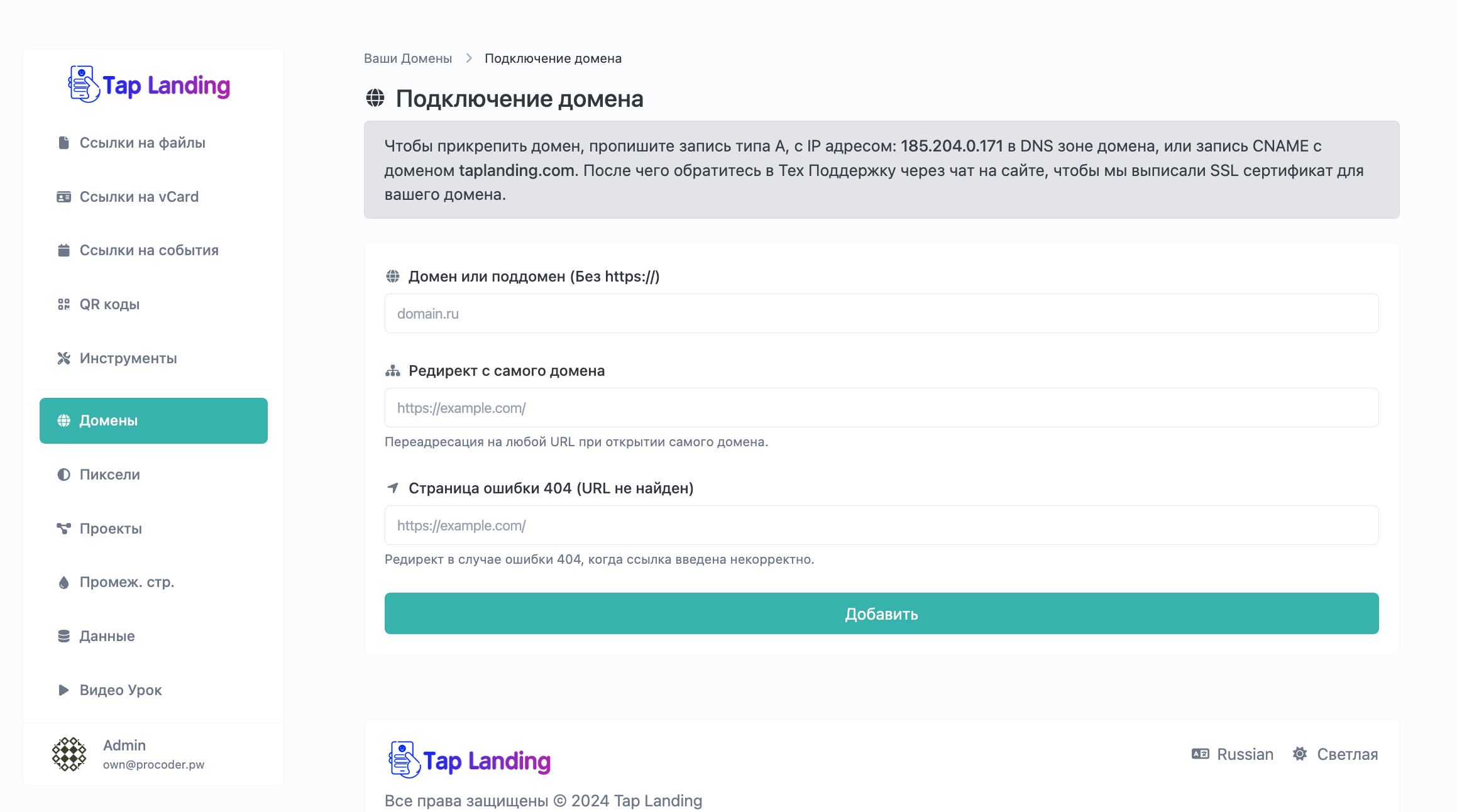 Да. По мимо доменов которые уже есть на сервисе, Вы можете добавить свой домен на любом из платных тарифов. Но нужно учитывать что все ссылки на минилендинги идут с дополнительным слагом в ссылке через слеш. Поэтому прикрепить только домен к конкретному ТапЛендингу нельзя. Но Вы можете указать в настройках домена редирект на Ваш Тап Лендинг как индекс редирект при открытии основного домена.