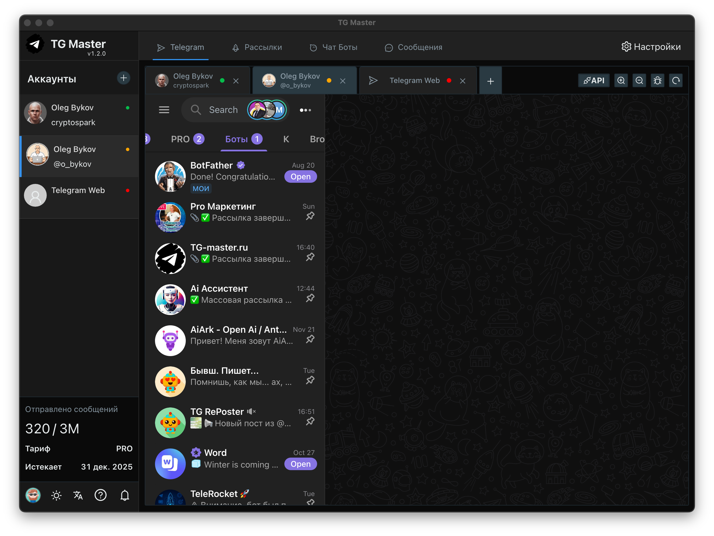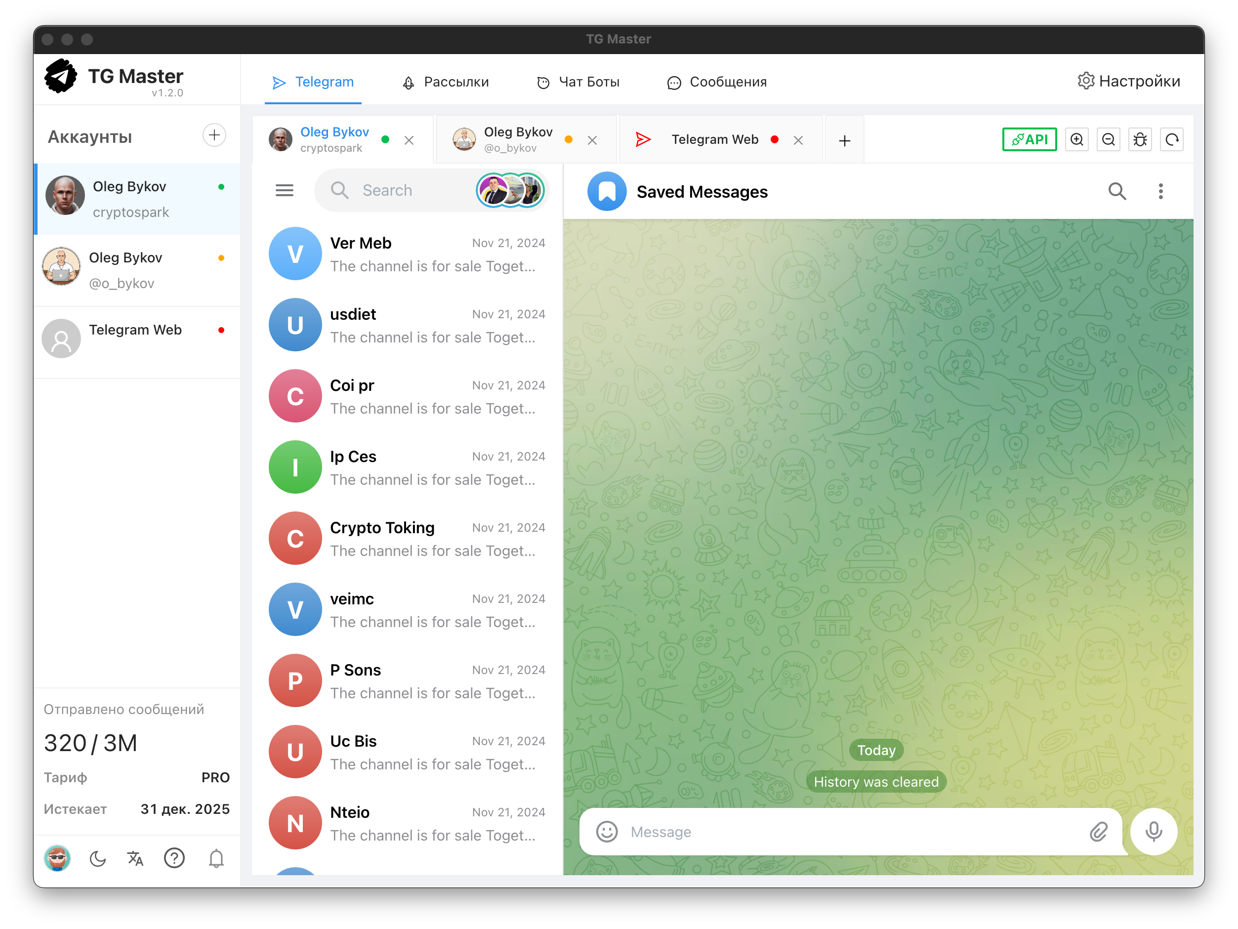 Работа с API и WEB: Программа комбинирует методы работы через Telegram API и Web-версию, что повышает стабильность и расширяет возможности автоматизации.