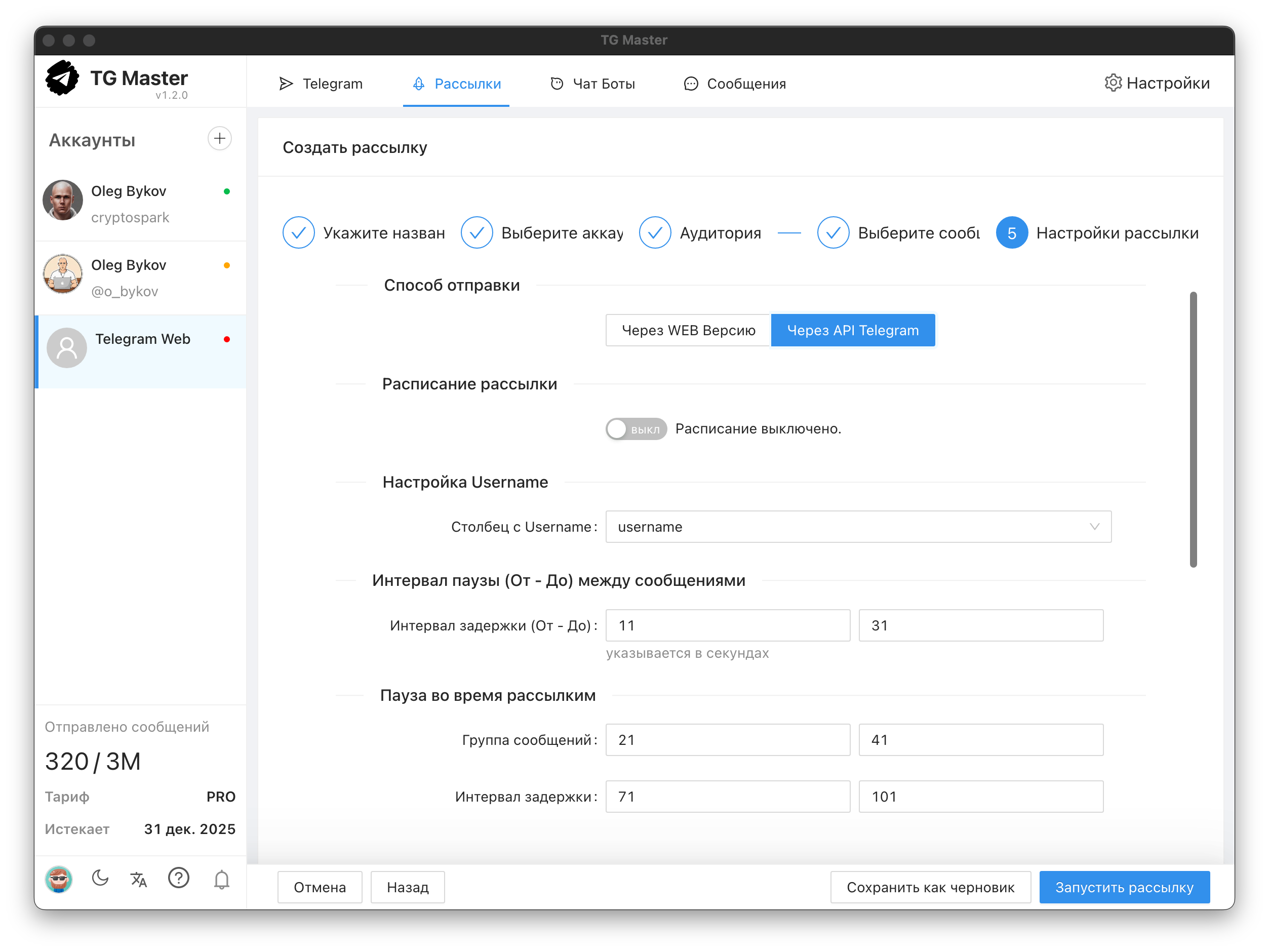 Массовые рассылки: Отправка персонализированных сообщений (текст, фото, видео) по личным чатам и группам. Система поддерживает умные задержки для имитации действий реального пользователя и защиты от блокировок.