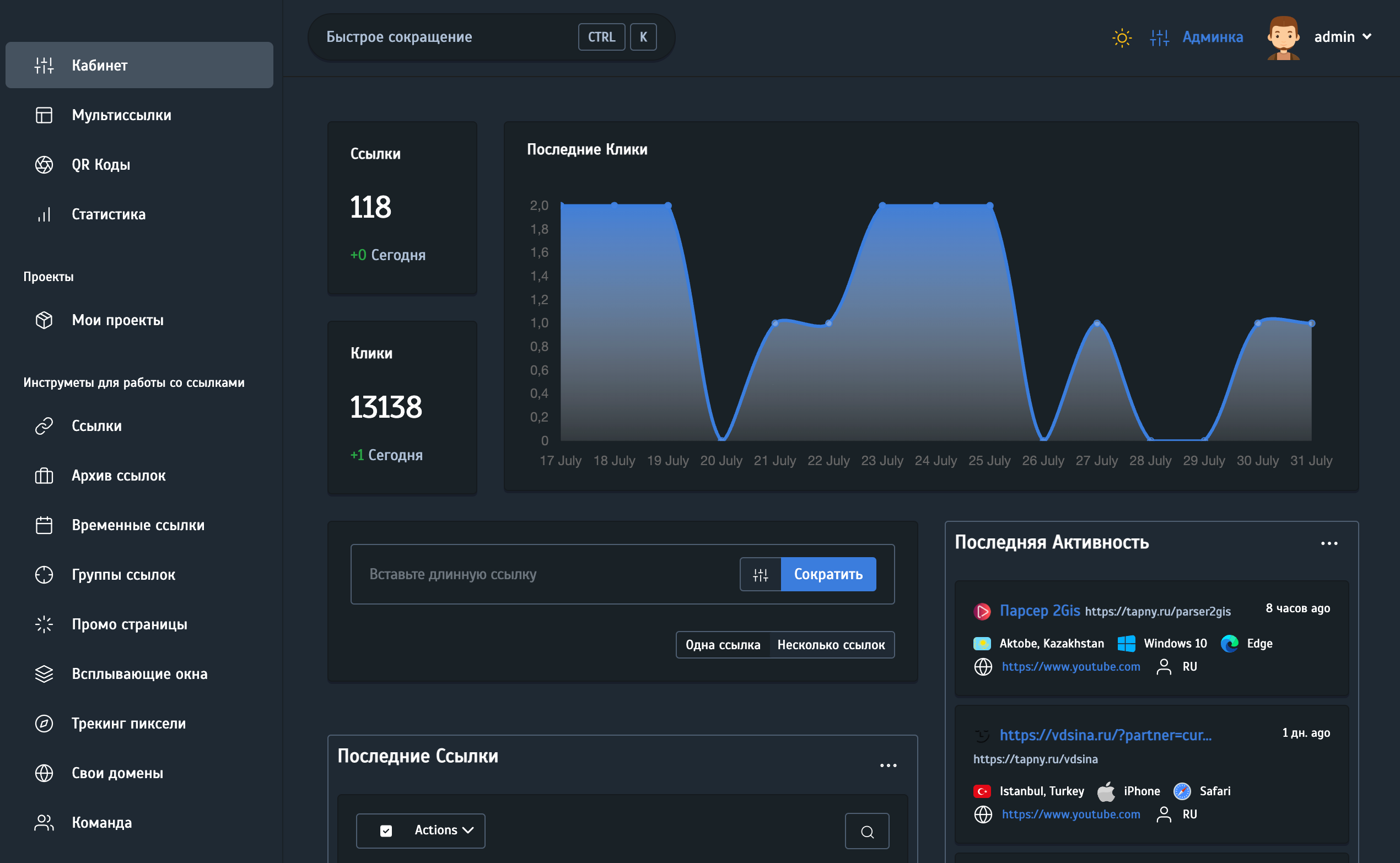 Аналитика: Подробная статистика и анализ кликов, включая данные о времени, местоположении и устройствах пользователей.